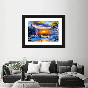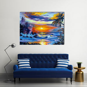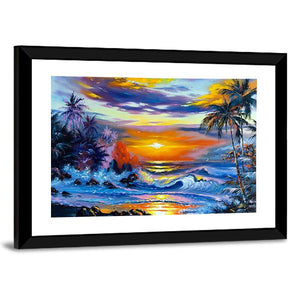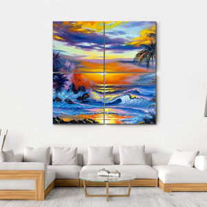 Capture the serene beauty of a sunset over ocean waves, flanked by graceful palm trees. This vibrant canvas art features a rich palette of oranges, blues, and purples, bringing a peaceful yet dramatic essence to any space.
