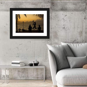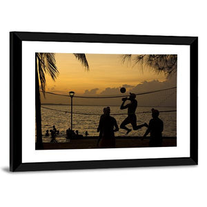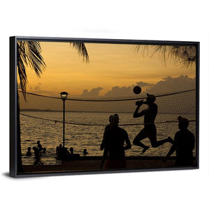 This beautiful canvas art captures the serene yet active scene of people playing beach volleyball at sunset. With warm hues of orange and yellow against a backdrop of palm trees and the ocean, it brings a touch of tropical tranquility to any space.
