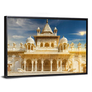 This canvas wall art features the ornate white building of Jaswant Thada, a masterpiece of Indian architecture. With its grand, majestic presence set against a sunny blue sky adorned with clouds, it brings a sense of tranquility and beauty to any space.