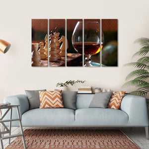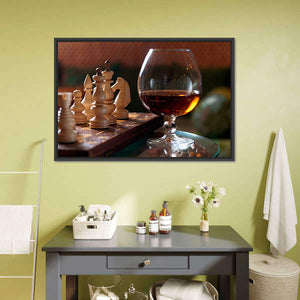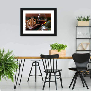 This canvas art features a captivating close-up of a wooden chess set alongside a glass of brandy. The tranquil palette of browns, whites, and ambers fosters a sophisticated atmosphere, making it an excellent addition to any cozy or contemplative space.