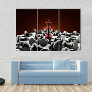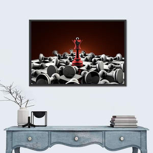 This canvas art features a dramatic scene where a lone red queen stands tall amongst fallen black pawns. Its modern and abstract style brings a strategic atmosphere to your space.
