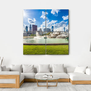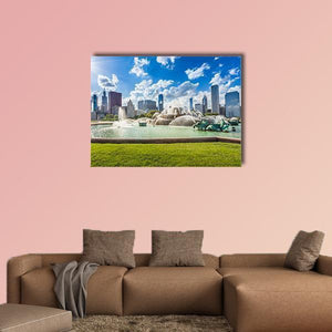 Bring a piece of Chicago into your home with this vibrant wall art featuring the iconic Buckingham Fountain against a backdrop of the city skyline. The bright blue sky and white clouds enhance the scenic atmosphere, making this piece a perfect fit for any room in need of a lively touch.