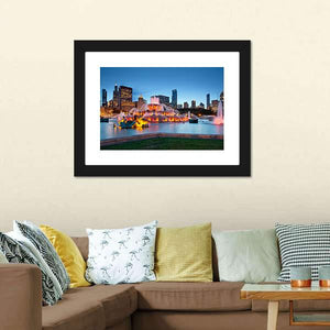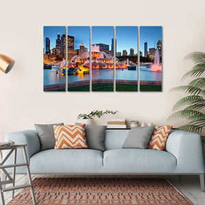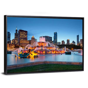This vibrant canvas art captures the dynamic beauty of Chicago's Buckingham Fountain, set against a lively skyline. The lively palette of blue, orange, yellow, and brown, along with the shimmering artificial lights, evoke an active, engaging atmosphere.