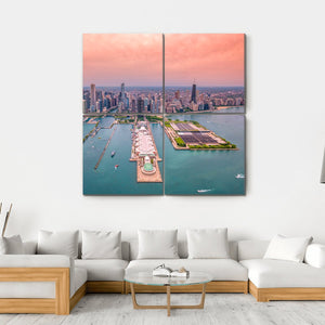 This striking canvas features the iconic Chicago skyline over Lake Michigan, captured from an aerial perspective. The expansive scene combines a serene palette of blue, white, and orange, evoking a lively urban atmosphere. Perfect for adding a touch of modern art to any space.