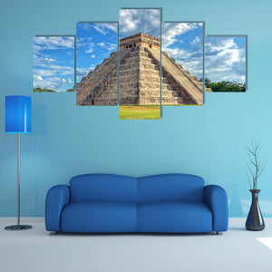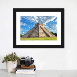 This canvas art features a majestic Mayan pyramid under a bright sky filled with fluffy clouds, surrounded by lush grass. Its realistic style and soothing palette of beige, blue, and green create an inviting atmosphere for any room.