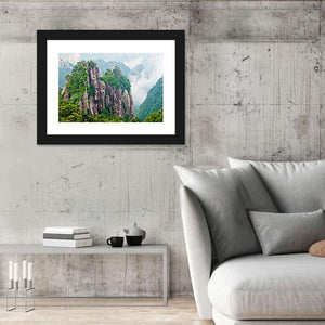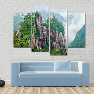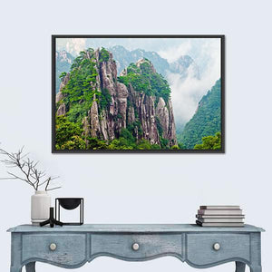 This striking landscape art showcases the majestic Huangshan mountains with their dramatic jagged peaks, lush greenery, and ethereal mist. The serene palette of greens, grays, blues, and whites brings the beauty of nature into any space.