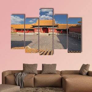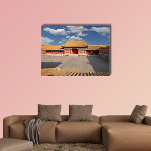 Chinese Imperial Palace Canvas Wall Art depicts an eye-level, wide view of a traditional Chinese courtyard with red buildings and yellow tiled roofs under a blue sky. Sunlight and soft shadows cross the paved courtyard, creating a peaceful, historic mood that suits room decor in modern or traditional interiors.
