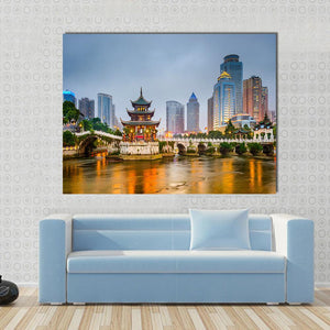 This canvas art captures the serene beauty of Guiyang City, featuring traditional Chinese architecture alongside modern skyscrapers. The vibrant hues of blue, orange, and gold evoke an illuminated atmosphere, perfect for adding a touch of culture to your space.