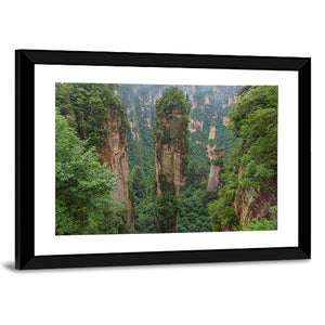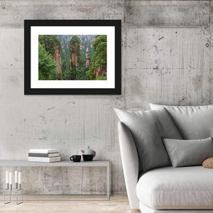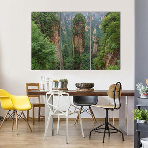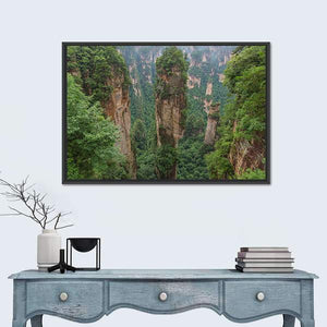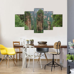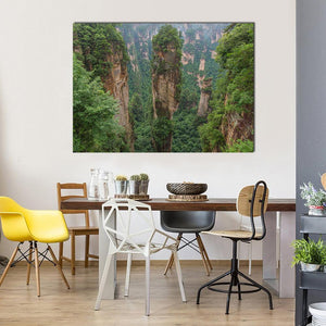 This canvas art captures the serene beauty of Zhangjiajie, showcasing tall sandstone pillars surrounded by lush green trees and misty mountains. Its natural palette of greens, browns, and grays creates a majestic atmosphere perfect for nature lovers.
