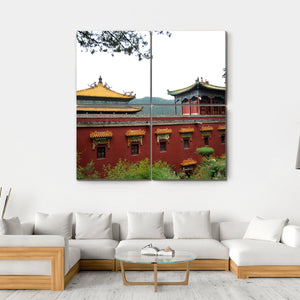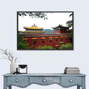 This canvas art captures the serene beauty of the Temple of Fu Shou in Chengde, showcasing its ornate roofs and vibrant red walls amidst lush trees and foliage. The traditional composition and rich colors evoke a peaceful atmosphere, making it a lovely addition to any room.