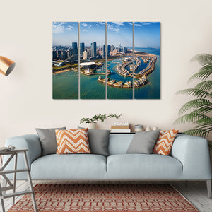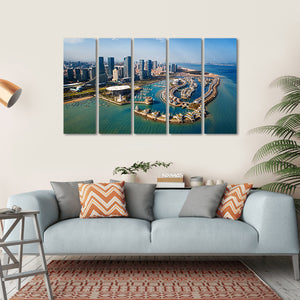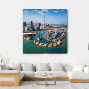 This vibrant canvas wall art captures Xiamen, a coastal city in China, from an aerial perspective. Featuring sleek skyscrapers and a bustling harbor dotted with numerous boats, it brings a modern touch to any space with its blue and green palette, showcasing a clear sky with soft clouds.