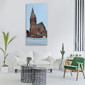 A realistic depiction of a brick cathedral in South Africa, showing a tall steeple, Gothic windows and a street sign arranged with a rule-of-thirds composition. Rendered in red, blue, gray and white, the piece carries a historic, serene and solemn mood and works well as wall decor in modern or traditional interiors.