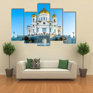 A photorealistic canvas print of the Cathedral of Christ Savior, showing its white facade and golden domes set against a blue sky. The low-angle, symmetrical composition gives the piece a grand, serene presence that suits living rooms and entryways.