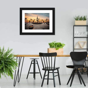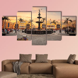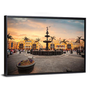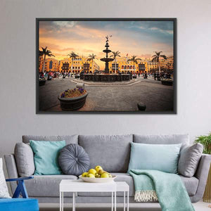 Lima Main Square Canvas Wall Art captures a wide-angle cityscape centered on an ornate fountain, colonial-style buildings, palm trees and people at dusk. Warm yellow and orange sunset tones create a vibrant, golden-hour mood that suits modern living rooms or entryways.