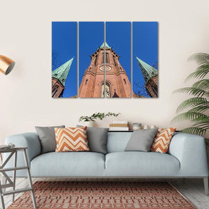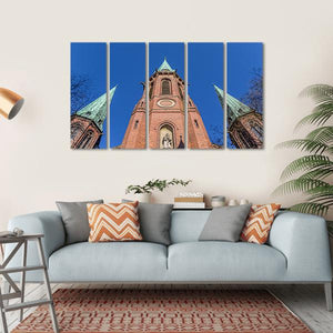 This canvas wall art captures the grandeur of the Lamberti Church in Oldenburg, showcasing its striking church tower and spires. The low-angle perspective emphasizes the historic architecture, while the red brick details contrast beautifully with the blue sky above.