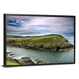 This canvas art depicts a serene coastal village nestled among green hills and a rocky shore, framed by a peaceful, cloudy sky. Ideal for bringing a touch of Ireland's beauty into your space, it complements a variety of decor styles with its calming palette of greens, blues, and whites.