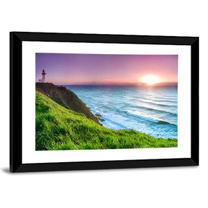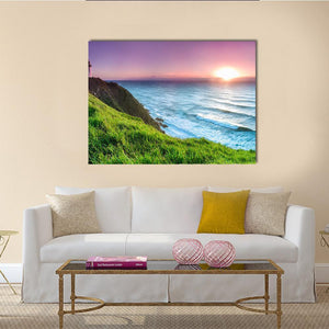 Byron Bay Lighthouse Canvas Wall Art shows a lighthouse on a grassy cliff with waves crashing and the sun setting over the horizon, rendered in purple, blue, green, and yellow. The rule-of-thirds composition gives a scenic, serene yet vibrant atmosphere. Suits coastal and modern interiors as a calming focal piece for wall decor.