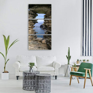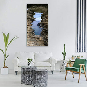 This Cornwall coastline canvas shows the sea framed by a natural rock archway, with sky, rugged rocks, and open water in soft blue-grey and brown tones. The composition emphasizes framing and depth for a serene, slightly adventurous mood, and it fits well in coastal, rustic, or modern rooms.