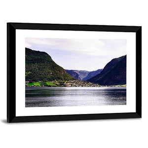 This photographic landscape shows a Norwegian fjord with distant mountains, green hillsides and a village reflected in calm water. The blue, green, grey and white palette creates a serene, depth-filled atmosphere. Suited to modern or Nordic-inspired rooms as a peaceful nature focal point.
