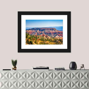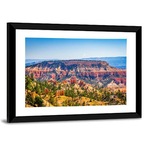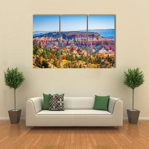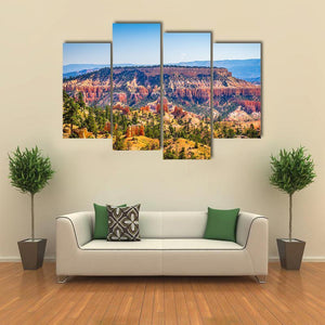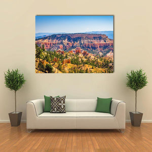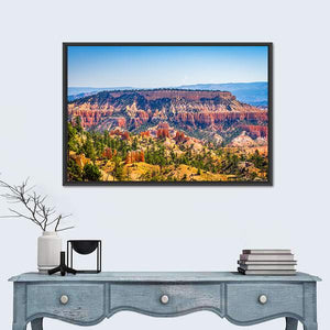 The Bryce Canyon Canvas Wall Art shows a wide, aerial view of canyon hoodoos, pine trees, and distant mountains in photorealistic detail. Its orange, green, blue and tan palette creates a majestic, serene sense of scale that fits modern home décor.