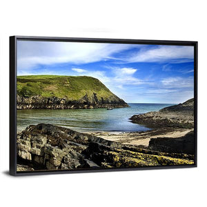 This canvas art captures a serene coastal cove in Cork, Ireland, featuring a rocky shore that meets clear blue waters. The photorealistic style and natural palette of greens, blues, and browns evoke a calm and bright atmosphere, ideal for enhancing any space.