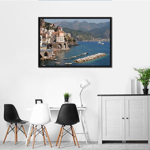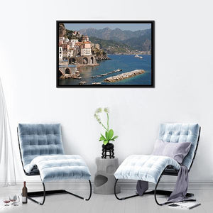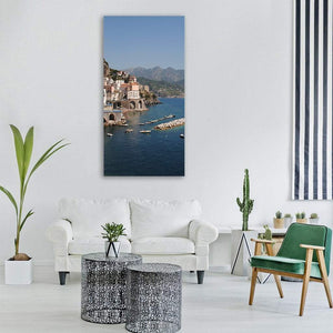 Amalfi Coast Vertical Canvas Wall Art presents a sunlit coastal village built on steep cliffs above calm blue water, with small boats in the harbor and distant mountains. The realistic, picturesque scene uses blues, whites, pinks, greens and tans to create a serene, summery mood that suits coastal or modern room decor.