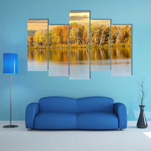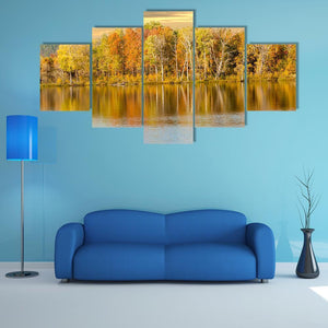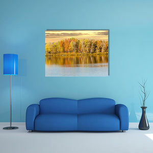 Autumn Forest And Lake Canvas Wall Art captures trees with autumn foliage beside a calm lake, their colors reflected in the water beneath a cloudy sky. The photorealistic landscape blends orange, yellow, green, blue, brown and grey to create a calm, serene and vibrant mood. Suits modern or nature-inspired room decor.