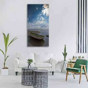 Baltic Sea Coast With Boat depicts a boat named SAILOR 385 resting along the shoreline beneath a broad, cloud-scattered sky. Realistic blues, whites, browns, and greens create a calm, peaceful, and vast atmosphere. It pairs naturally with coastal or modern room decor.