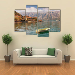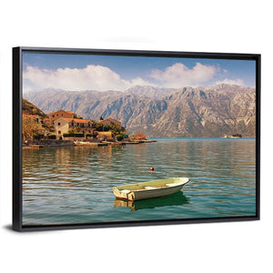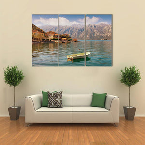 This realistic landscape captures the Bay of Kotor in Montenegro, showing mountains, a village by the water and a small white rowboat on calm blue-green seas. The rule-of-thirds composition and soft blue, green, tan and white palette create a serene, peaceful mood that fits coastal or modern room decor.