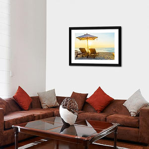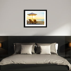 This canvas wall art features two beach chairs beneath a large umbrella against a tranquil sunset, embodying relaxation by the ocean. The serene palette of golden hues and soft blues invites a peaceful atmosphere to any space.