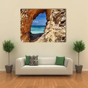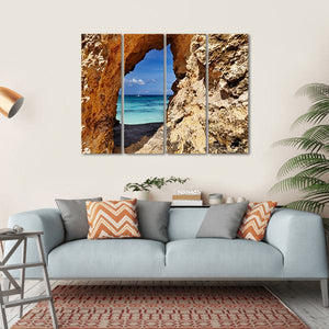 Experience a serene ocean view with our Beach Through Hole In Rock canvas art. This photorealistic piece captures the tranquility of a rock cave framing the gentle waves and clear sky, bringing an inviting coastal vibe to your space.