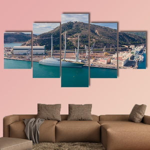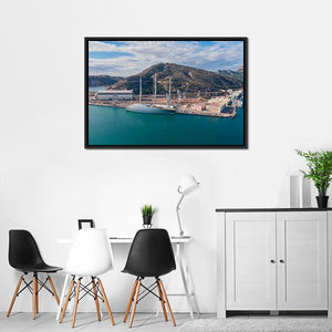 Aerial view of a large sailing yacht docked in a Spanish harbor, captured in a photorealistic style with teal and blue tones. The scene feels serene and scenic while showing industrial shipyard buildings and hilly terrain. Suits modern coastal or nature-inspired rooms.