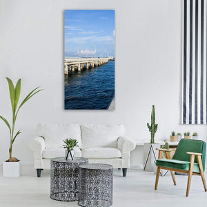 This canvas depicts a pier reaching into the ocean under a clear blue sky, with wooden pilings and streetlights drawing the eye. The simple perspective and cool blue, white, and gray palette create a calm, serene mood. It suits modern, minimalist rooms and offers a quiet focal point for room decor.