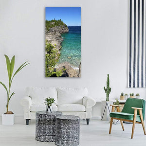 A photorealistic canvas print of the Bruce Peninsula coastline captures sunlit rocky cliffs, clear turquoise water, and dense green foliage. Its serene, natural brightness suits coastal or nature-inspired rooms and modern wall decor.