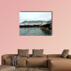 Busan Port Canvas Wall Art shows a quiet, overcast harbor with numerous docked ships and distant city buildings. Rendered in realistic blues, grays, and browns with a mid-shot composition, this canvas print brings a calm, industrial seaside mood that suits modern or industrial interiors.