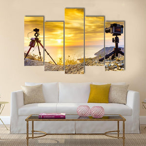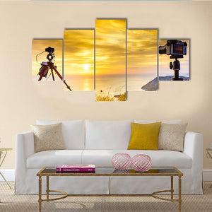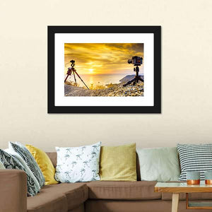 This print captures two cameras on tripods perched on a rocky cliff, watching a golden sunset over the ocean. The photorealistic scene uses yellow, orange, blue, and grey tones with dramatic lighting and a rule-of-thirds composition to create depth and a serene, inspiring mood. It fits well in modern living rooms and home offices as a calm coastal accent.