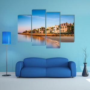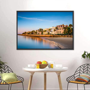 This canvas features a serene landscape with charming buildings, palm trees, and coastal views. The warm colors of blue and sand evoke a peaceful, beachy atmosphere, adding a touch of coastal charm to your space.