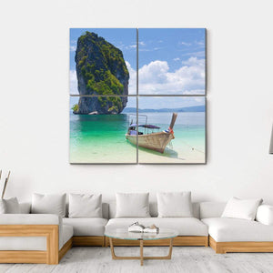 This canvas art captures the serene beauty of Thailand's coastline, featuring longtail boats nestled against dramatic rock formations. The tropical palette of blue and green creates a calming atmosphere, making it a great addition to your wall decor.