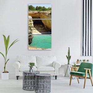 Photographic canvas print of a cliff-side beach and cave, with turquoise water and a sandy shore framed by lush green cliff tops. The scene feels serene and natural, suited to coastal or modern living spaces as a calm focal point.