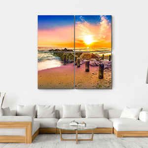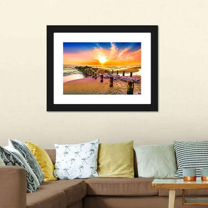 This vibrant artwork showcases a serene beach at sunset, highlighting the warm hues of orange and yellow against a dramatic sky. The scene captures wooden pilings and a rocky shore, evoking a peaceful coastal atmosphere that's perfect for any room.