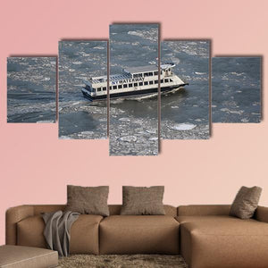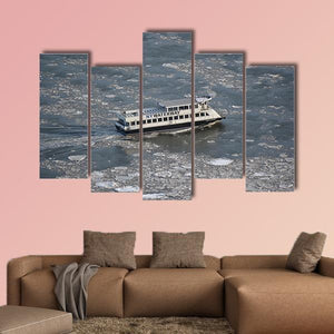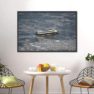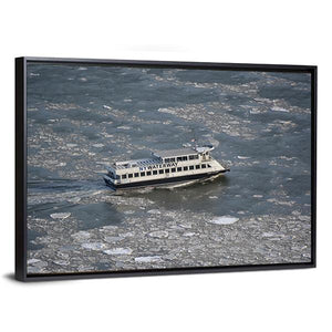 A realistic canvas print of a NY Waterway ferry moving through icy blue-gray water on New York’s East River. The rule-of-thirds composition and cool palette of blue, gray, and white create a cold, industrial journey feel. Works well in modern or nautical-inspired rooms that lean toward urban decor.