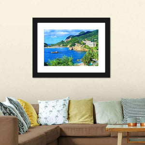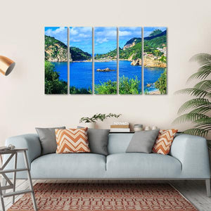 This canvas wall art captures a serene coastal landscape of Corfu Island, showcasing a tranquil bay framed by cliffs and lush trees. With a bright palette of blue, green, and white, it evokes a picturesque summer day, perfect for refreshing your space.