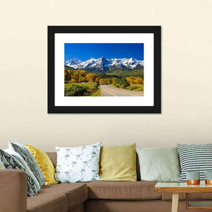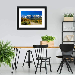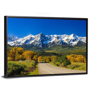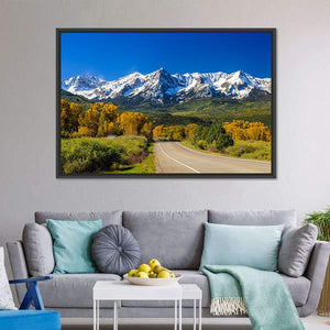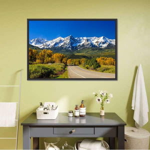This canvas art features a stunning landscape of snow-capped mountains, vibrant autumn trees, and a winding road beneath a deep blue sky. The peaceful atmosphere makes it a perfect addition to nature-inspired spaces.