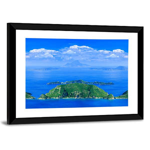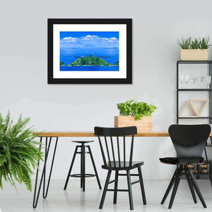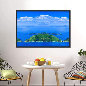 A panoramic photographic canvas showing multiple lush green islands, clear blue water, distant mountains and soft clouds. The scene feels serene and expansive, a calm focal point for modern living rooms or bedrooms that favor nature-driven decor.