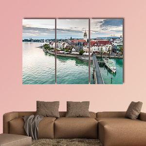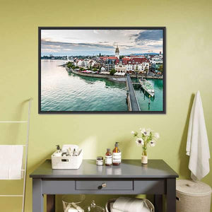 Friedrichshafen City, Germany shows a waterfront cityscape with boats, a bridge, a pier and a church steeple viewed from an overhead perspective. The realistic, detailed print uses blue, white, brown and green tones to create a serene yet lively atmosphere. It fits well in modern living rooms, hallways or offices as a calm focal point.