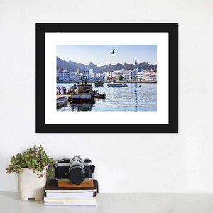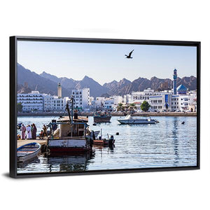 A realistic view of Muttrah’s fish docks, showing fishing boats, waterfront buildings, a mosque and distant mountains. Sunlit blues, whites and soft browns create a serene, tranquil atmosphere. Suits modern or coastal-inspired rooms and simple wall décor schemes.