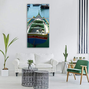 A realistic close-up of a fishing boat on calm sea water, rendered in blues, greens, yellows and touches of red to convey a quiet maritime mood. This canvas print suits coastal, nautical, or nature-inspired room decor where a serene sea scene is wanted.