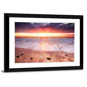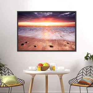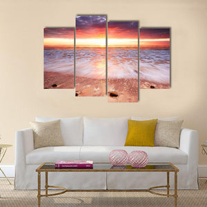 This canvas captures an ocean beach at sunset, with rocks, wet sand and foamy waves beneath dark clouds. Orange, purple and pink tones create a serene yet dramatic mood, and the modern rule-of-thirds composition suits contemporary living rooms or bedrooms.
