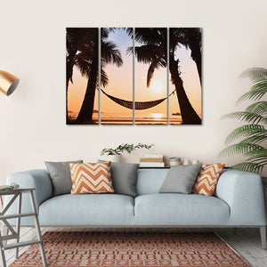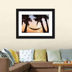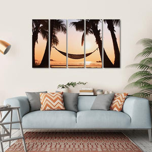 Bring a tranquil tropical vibe to your space with this canvas featuring a hammock nestled between two palm trees, set against a stunning sunset over the ocean. The peaceful palette of orange, blue, and pink invites a serene atmosphere, perfect for any room that seeks a touch of nature.