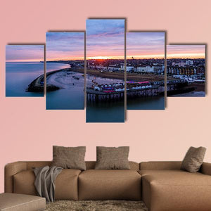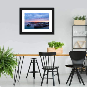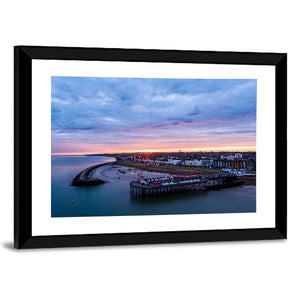 Herne Bay Pier At Sunrise captures the pier and coastline at sunrise in a serene, atmospheric scene. A wide aerial view shows boats docked by the pier beneath dramatic clouds, with soft blues, pinks and oranges that suit coastal or modern rooms as a calm focal point.